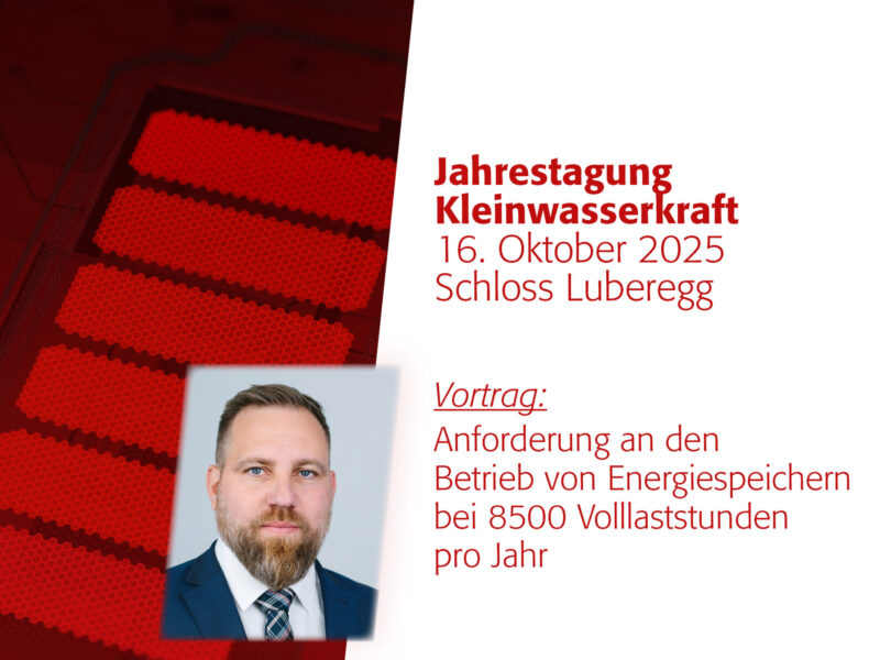 Am 16. Oktober 2025 findet die Jahrestagung Kleinwasserkraft statt, und wir freuen uns dass unser Stefan Haslinger praxisorientierte Einblicke zum Thema „Anforderungen an den Betrieb von Energiespeichern bei 8500 Volllaststunden pro Jahr“ teilen wird.